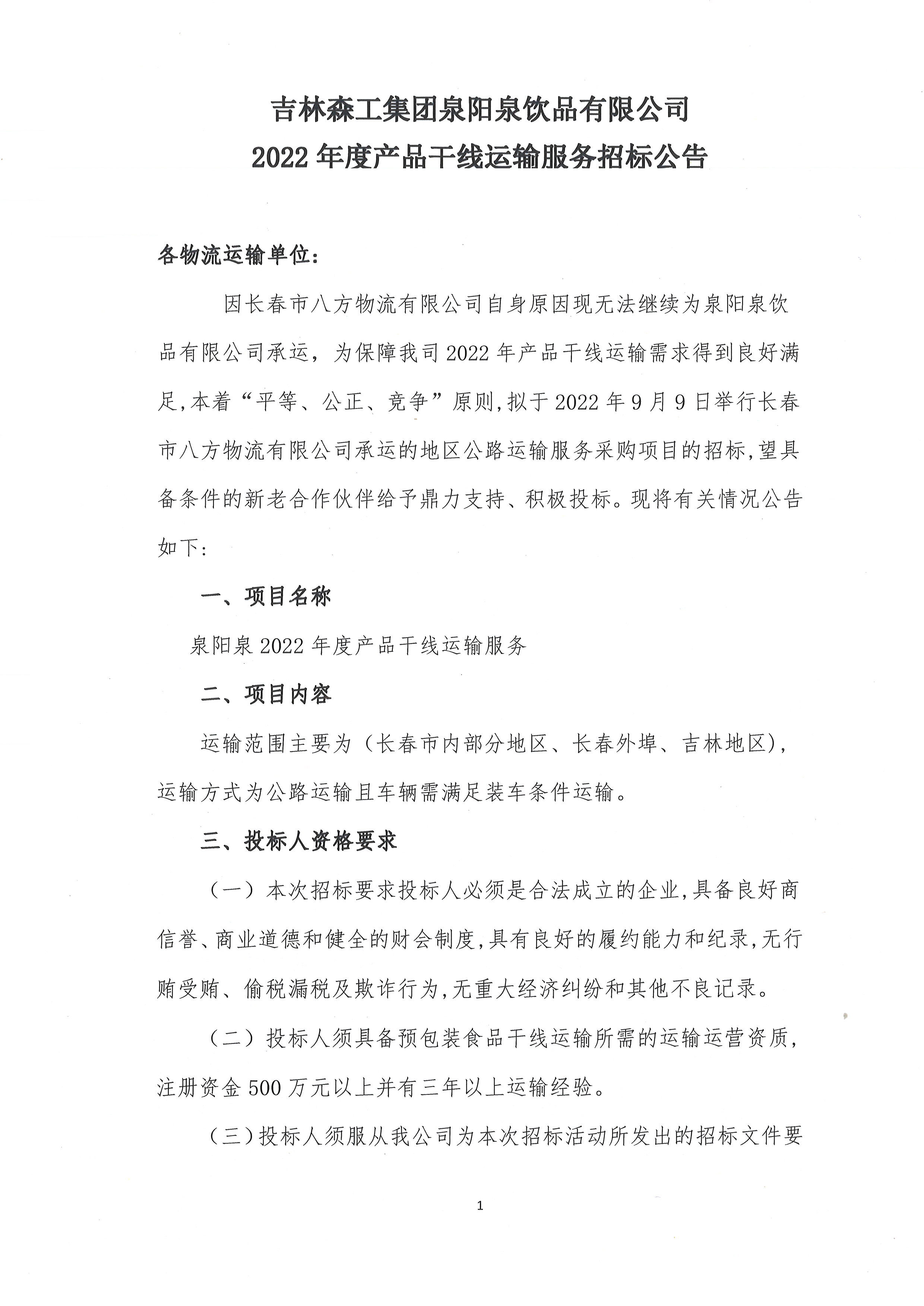 2022年度產(chǎn)品干線運(yùn)輸服務(wù)招標(biāo)公告